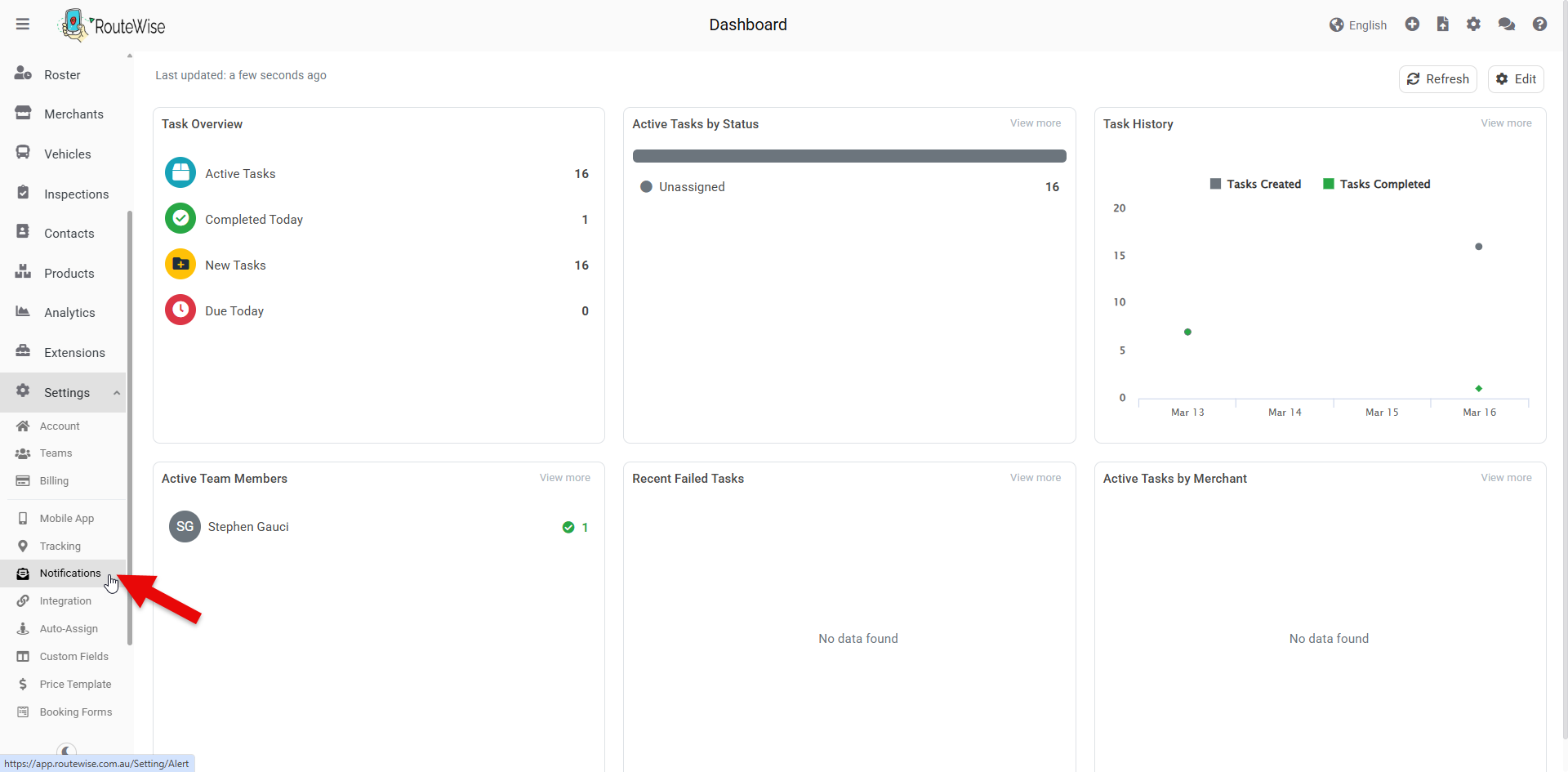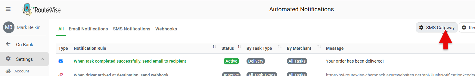 Continue the integration process by logging into your RouteWise account with administrative credentials. Navigate to the Settings section, typically found in the main navigation menu or under your account profile options. Within Settings, locate the Notifications page: